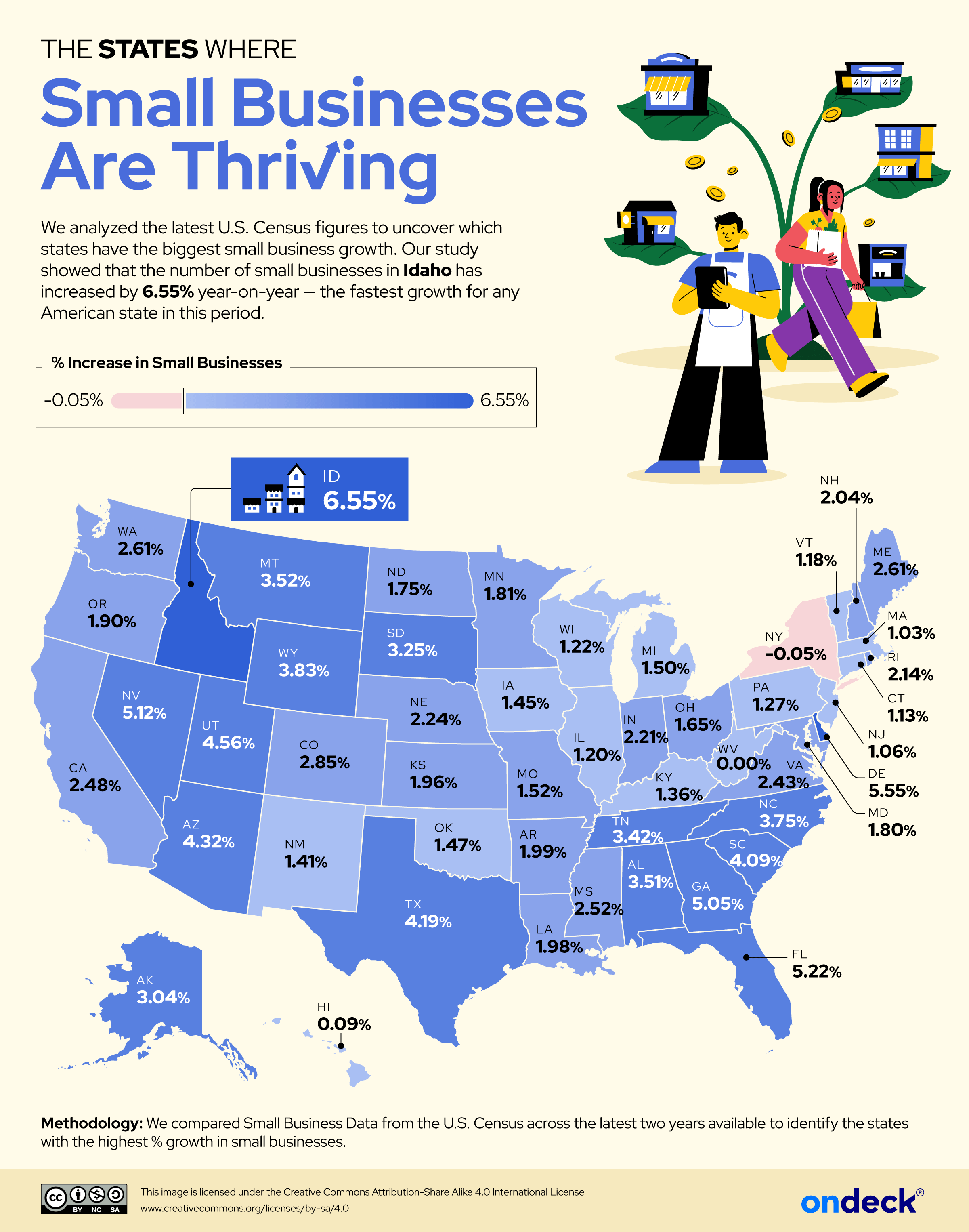 • Idaho is the state where small businesses are growing the fastest, with a +6.55% increase year-on-year.