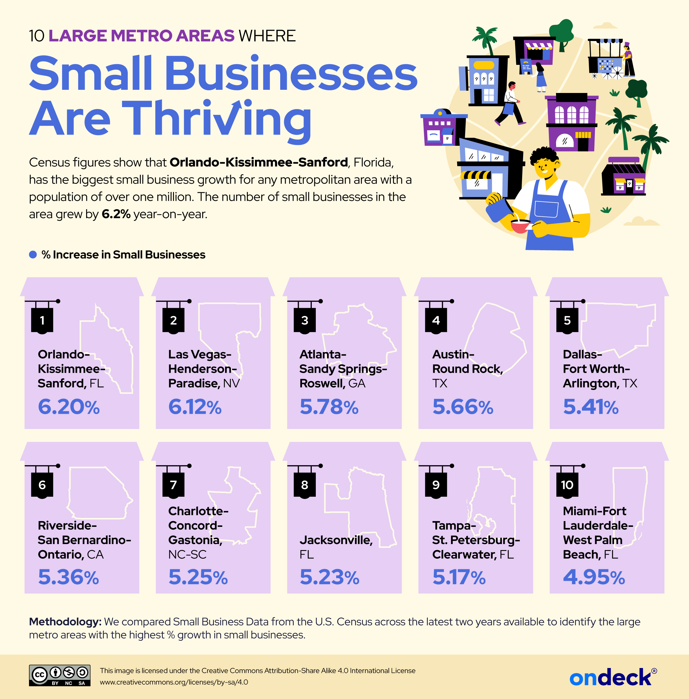 The large metropolitan area where small businesses are thriving the most is Orlando-Kissimmee-Sanford, with a 6.20% rise in the number of firms year-on-year (above).