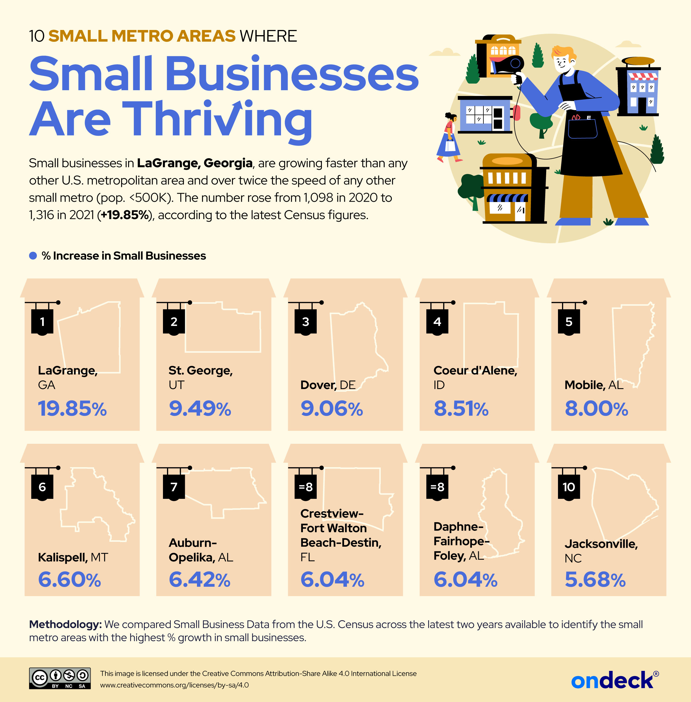 • The metropolitan area with the greatest increase in small businesses year on year is LaGrange, Georgia (+19.85%).