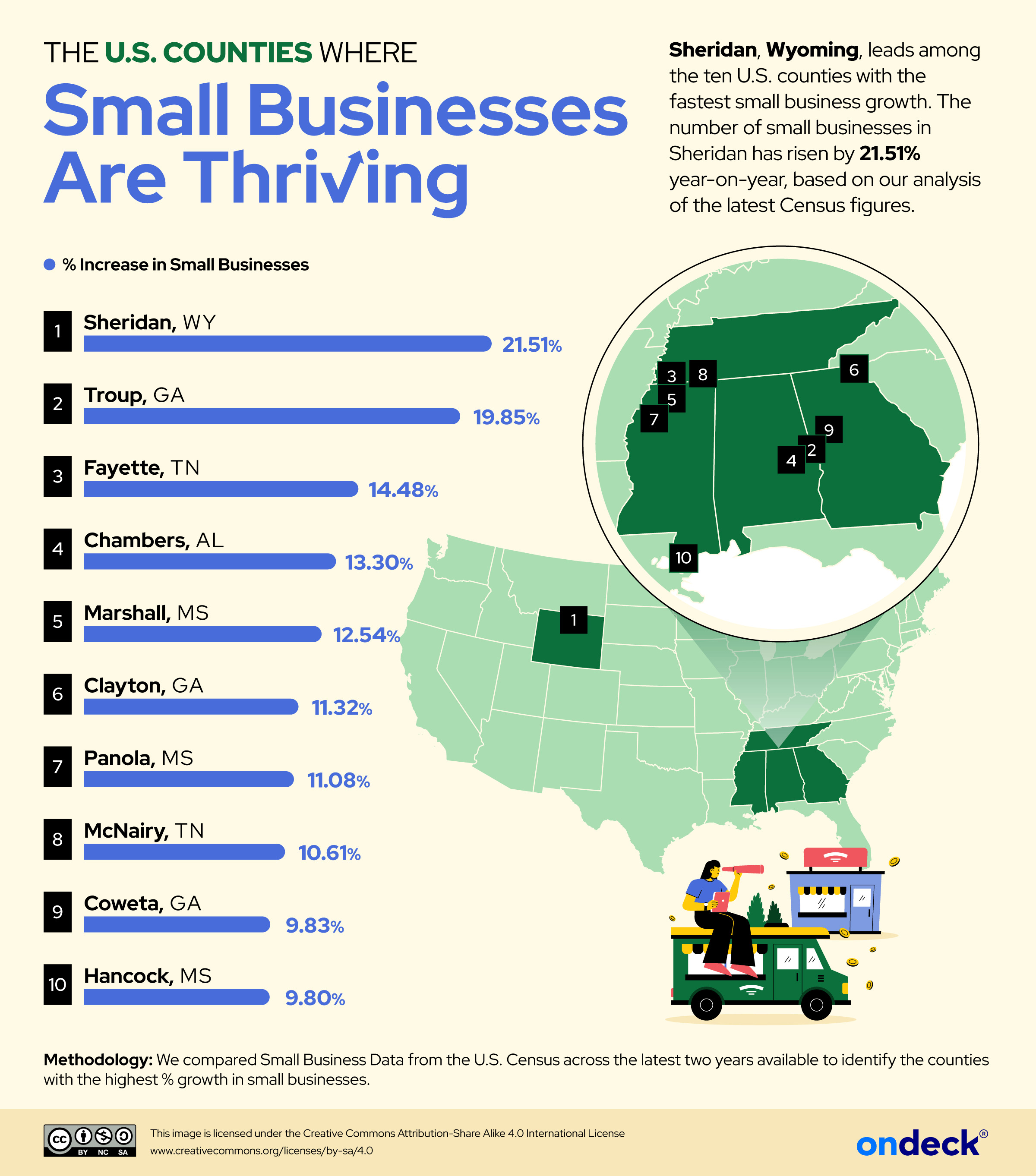 • Sheridan County, Wyoming, is the county where small businesses are thriving the most (+21.51% year-on-year).