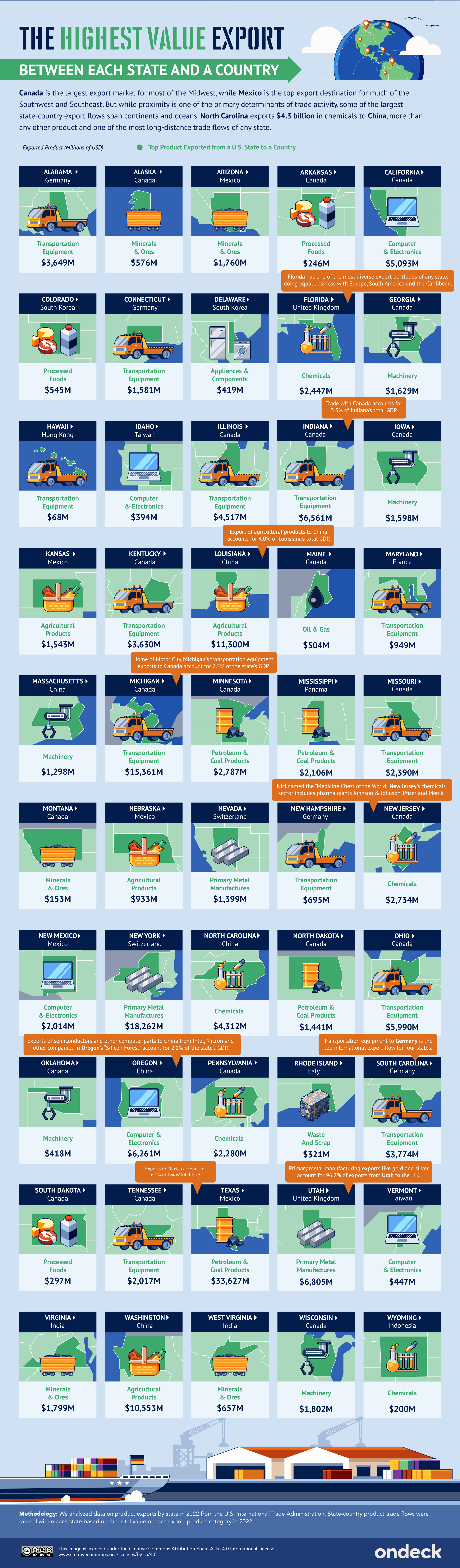 In a moment of rapid geo-political change, it pays to keep an eye on the comings and goings of American products — and to stay abreast of who the country’s best customers are. So, following our guide to Every State’s Top Import and Export, we plunged into the latest data on product exports by state in 2022 from the U.S. International Trade Administration to identify the biggest export destinations for products from every U.S. state.