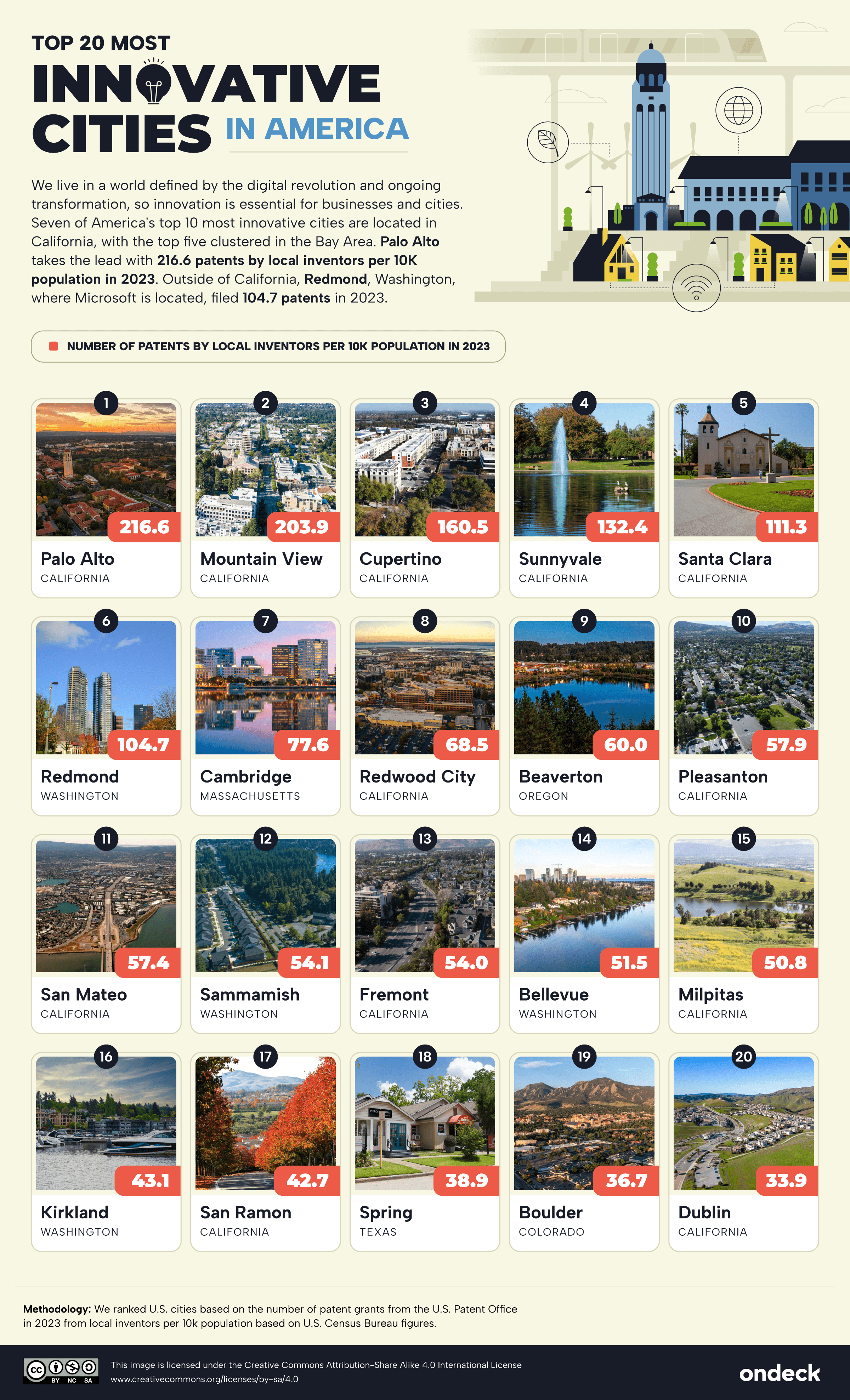 • Redmond, WA, is the most innovative city outside of California, with 104.7 patents per 10,000 people in 2023.