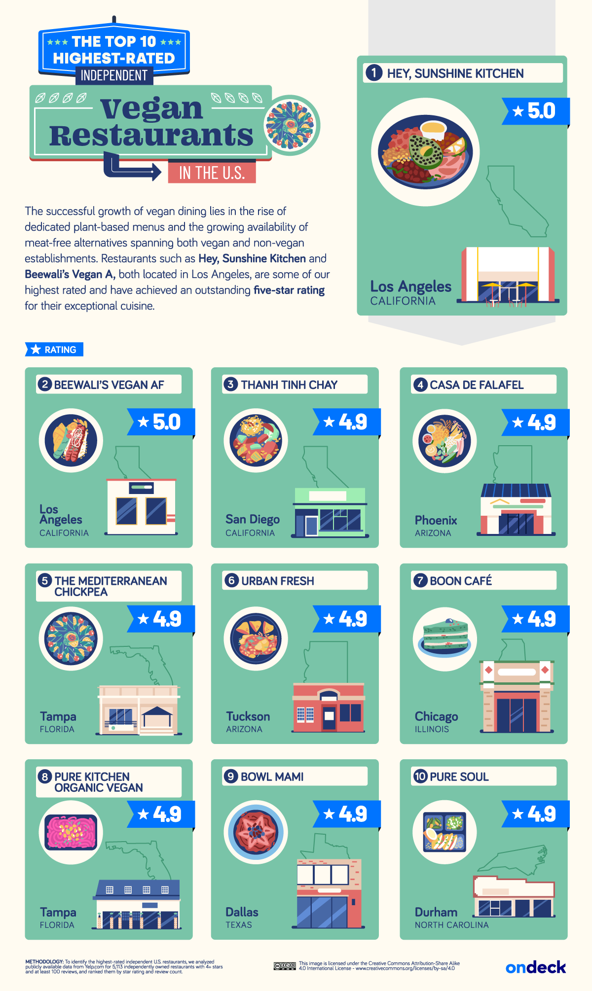 Overall, three indie restaurants tie as the highest-rated in the U.S., each boasting a perfect average rating of five out of five and ordered in our graphic below by the number of ratings they’ve received. Two of these restaurants can be found in the health-conscious city of Los Angeles and both specialize in plant-based cuisine.