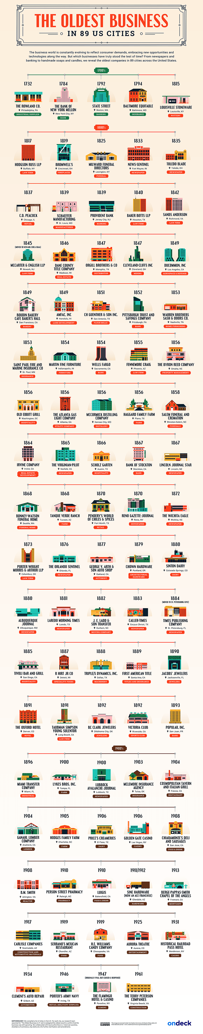 In cases where a business was bought out, we included said business if there was a reasonable degree of continuity. For merged businesses, we used the date of the oldest business. Any data which lacked a reasonable degree of certainty was excluded from the final article. If you believe that your city has an older business, we’d love to hear from you.