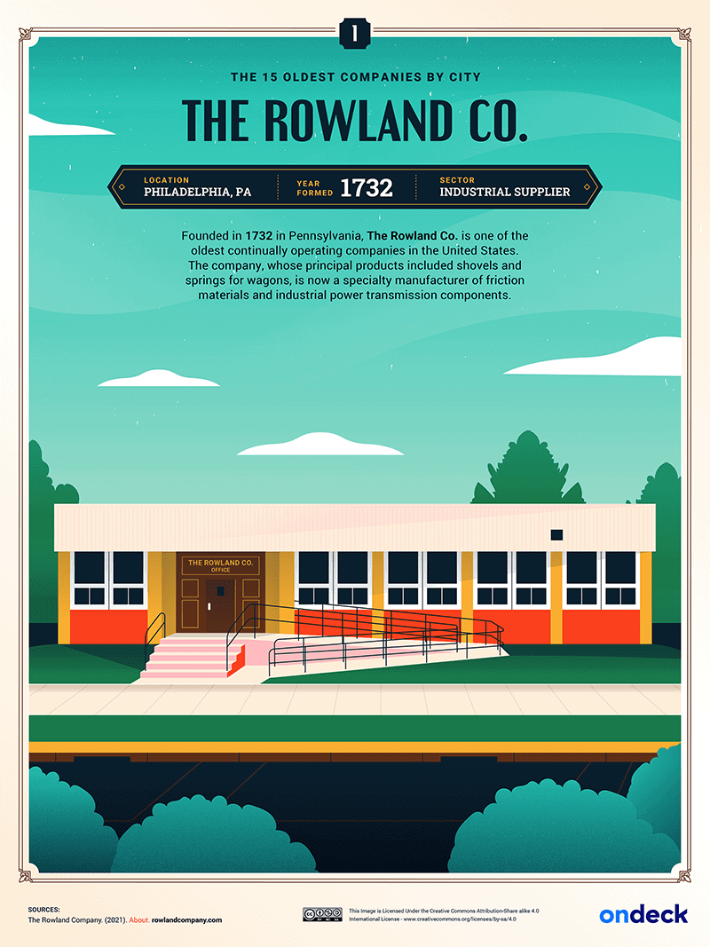 - The oldest business in a major U.S. city is The Rowland Co. in Philadelphia, founded in 1732.