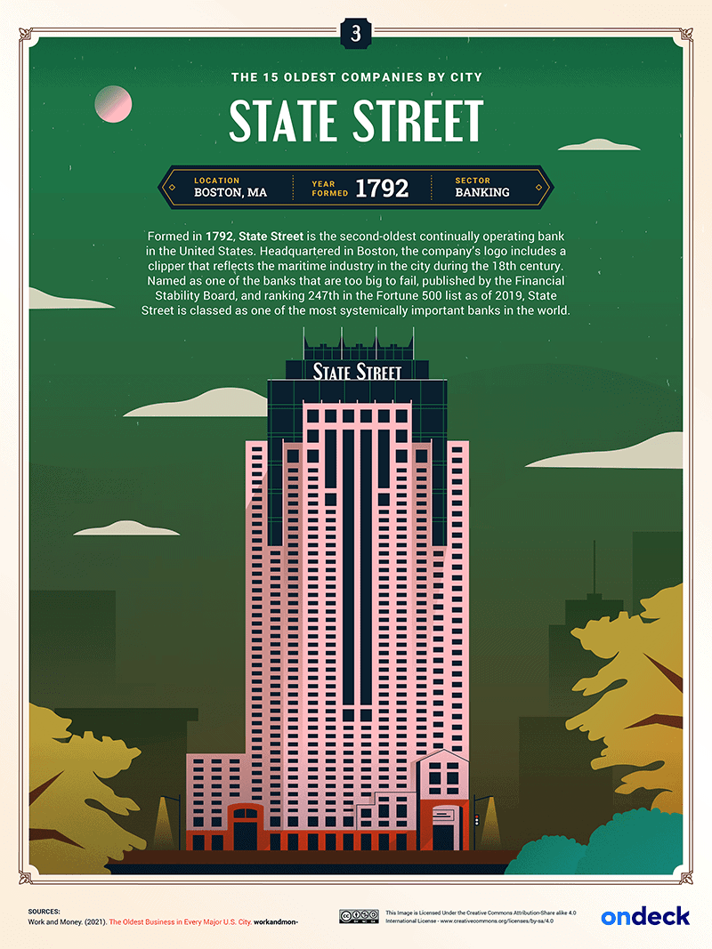 State Street is Boston’s oldest business and traces its roots to the golden age of maritime in the city – hence the clipper ship in the logo. Massachusetts Governor John Hancock chartered the business as Union Bank in 1792, and it was renamed after Boston’s “Great Street to the Sea” after merging with State Street Deposit & Trust Co in 1925.