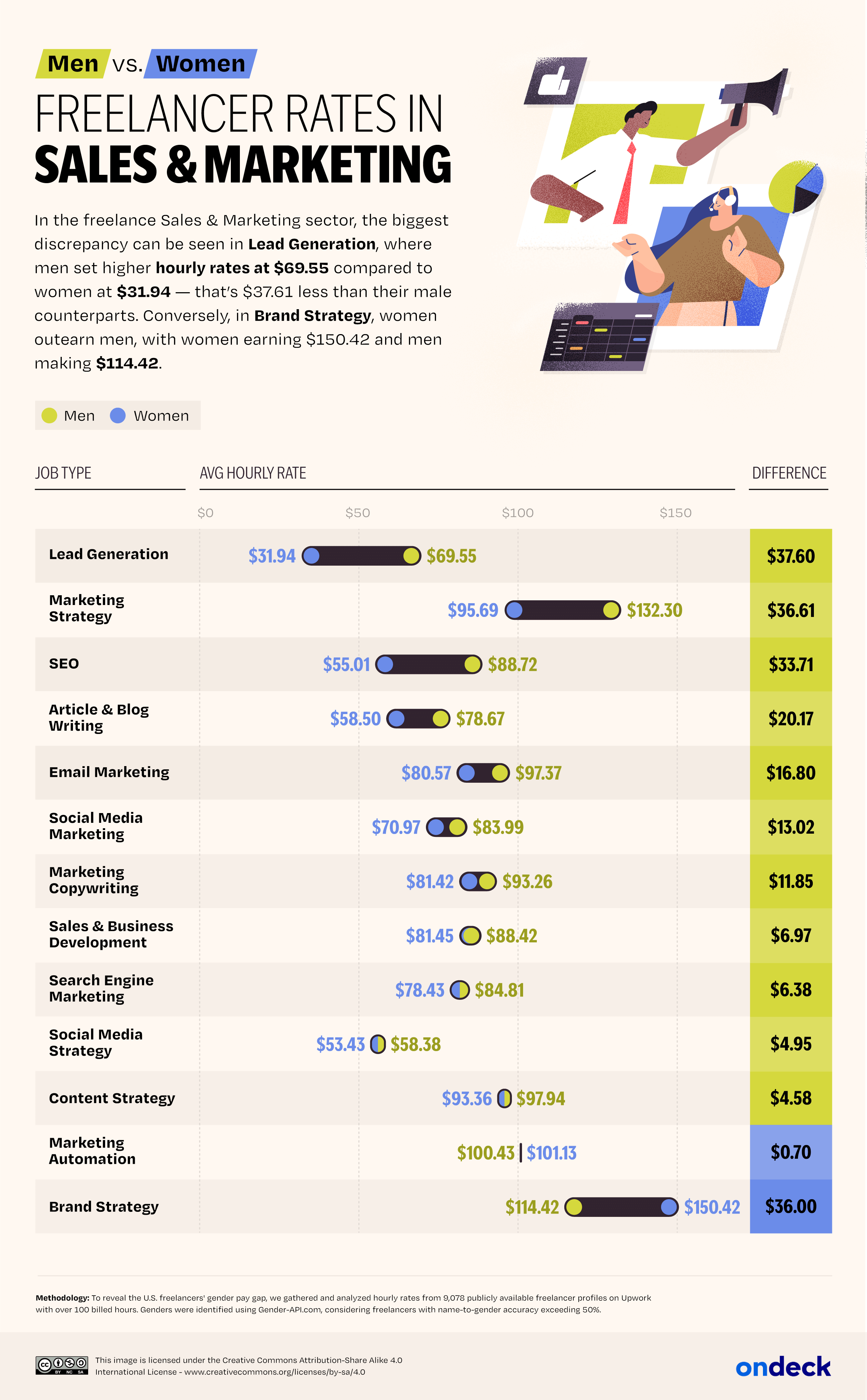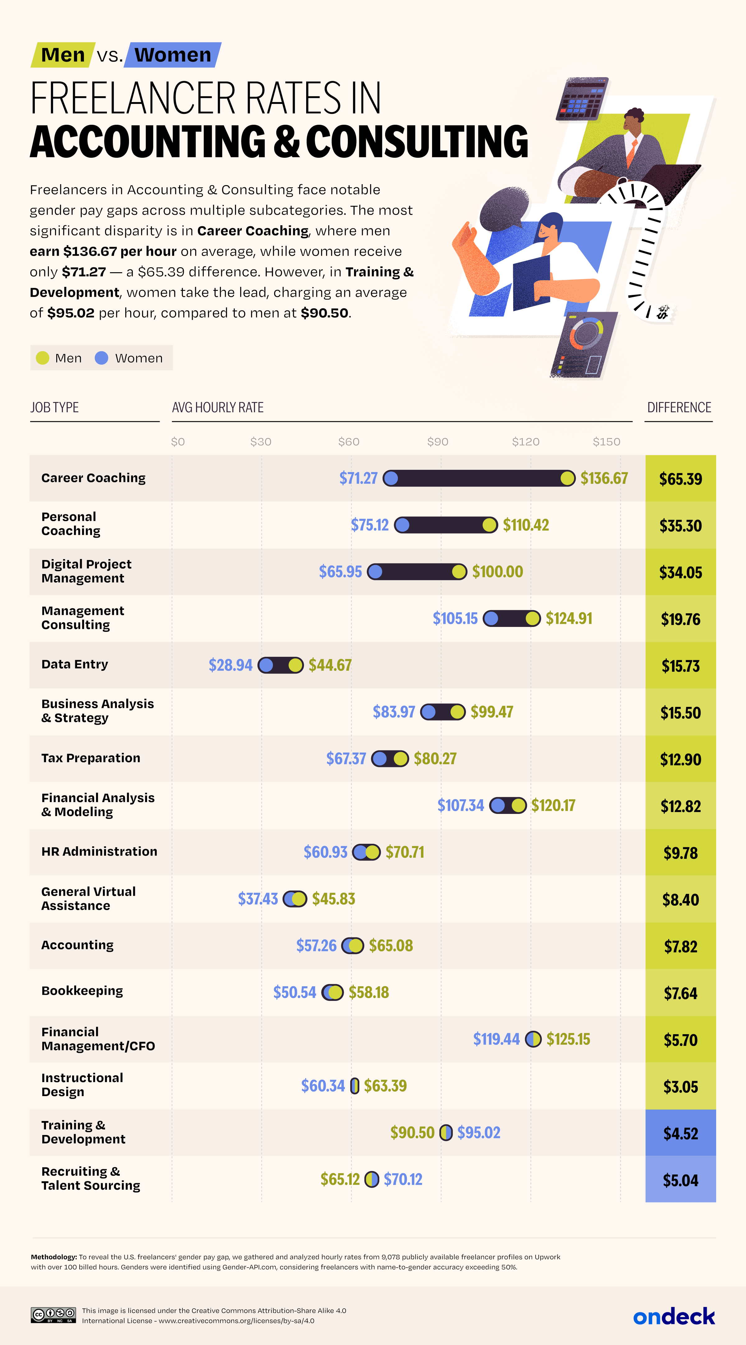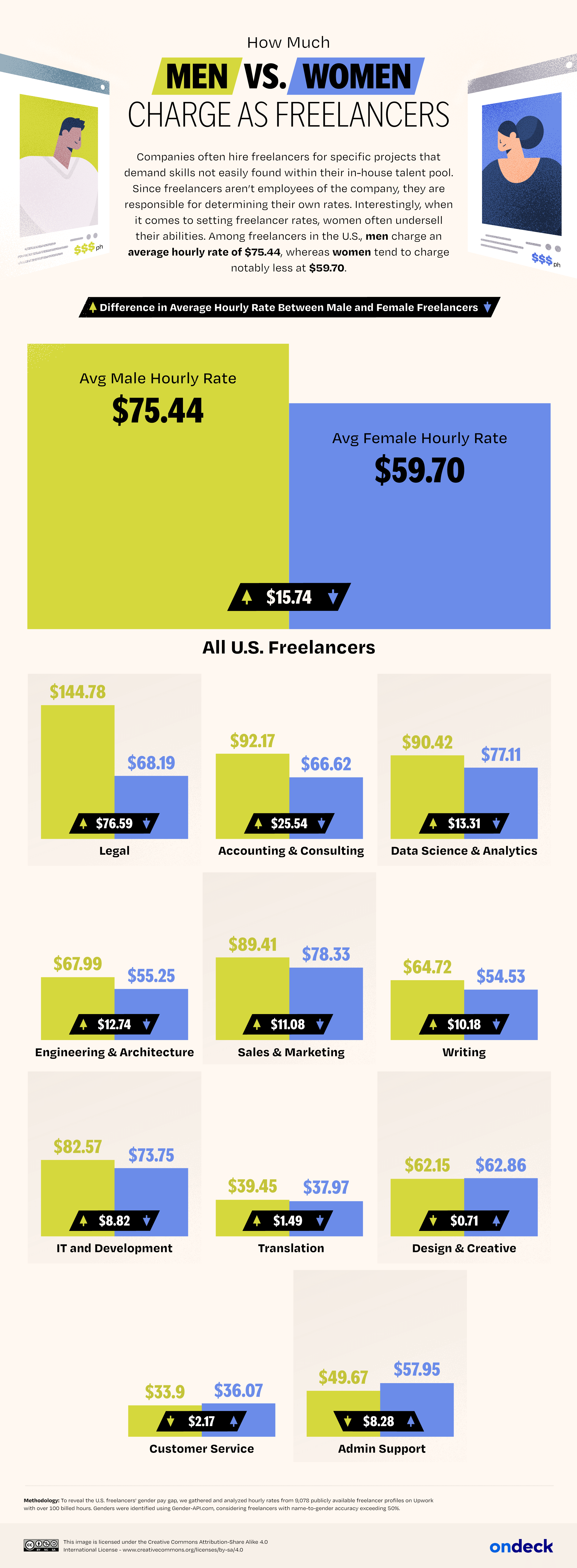 Data analysts at OnDeck analyzed the hourly rate charged by 9,078 U.S.-based freelancers on Upwork who have billed 100+ work hours and calculated the difference between hourly rates for male and female freelancers by state, overall and for each of 11 work categories (Legal, Accounting & Consulting, Data Science & Analytics, Engineering & Architecture, Sales & Marketing, Writing, IT and Development, Translation, Design & Creative, Customer Service, Admin Support).
