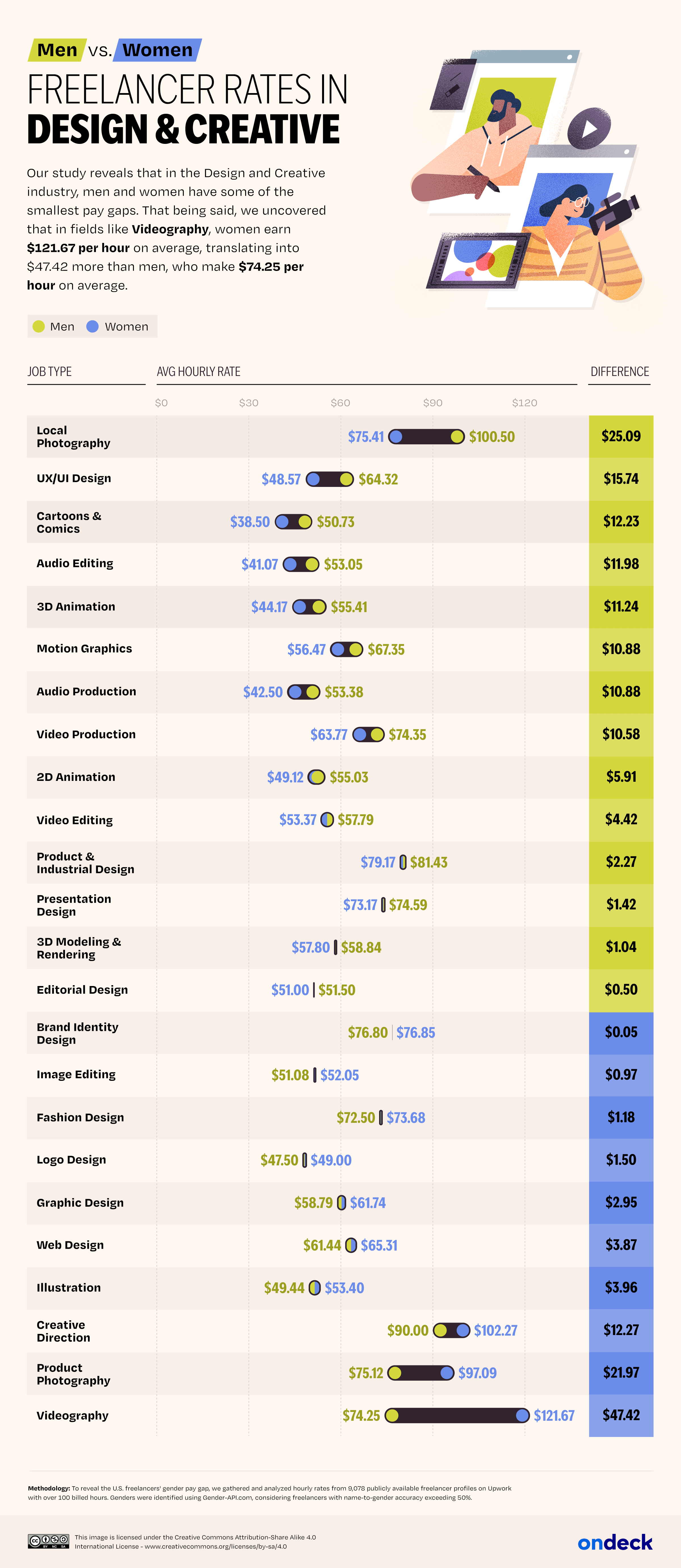 Design & Creative is the category in which the top pay disparity favoring men is the lowest of all: Local Photographers who are men charge $25.09/hour more than women. However, ten of the 24 roles in this category have a pay gap that favors women — and the biggest gap of all is in Videography, where women charge $47.42 more than men.