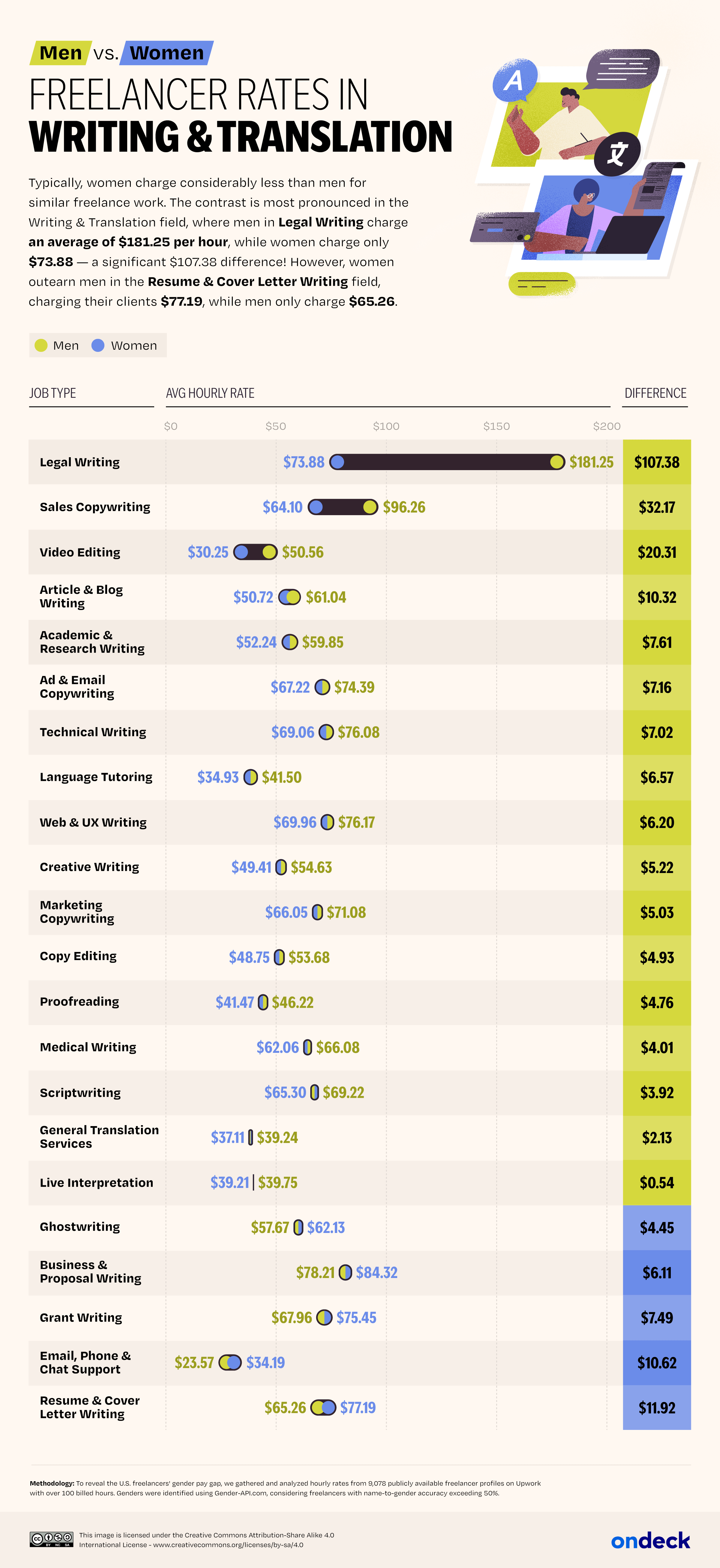- The role with the biggest rate difference is Legal Writing (under the Writing category), for which men charge $107.38/hour or 145.4% more than women.