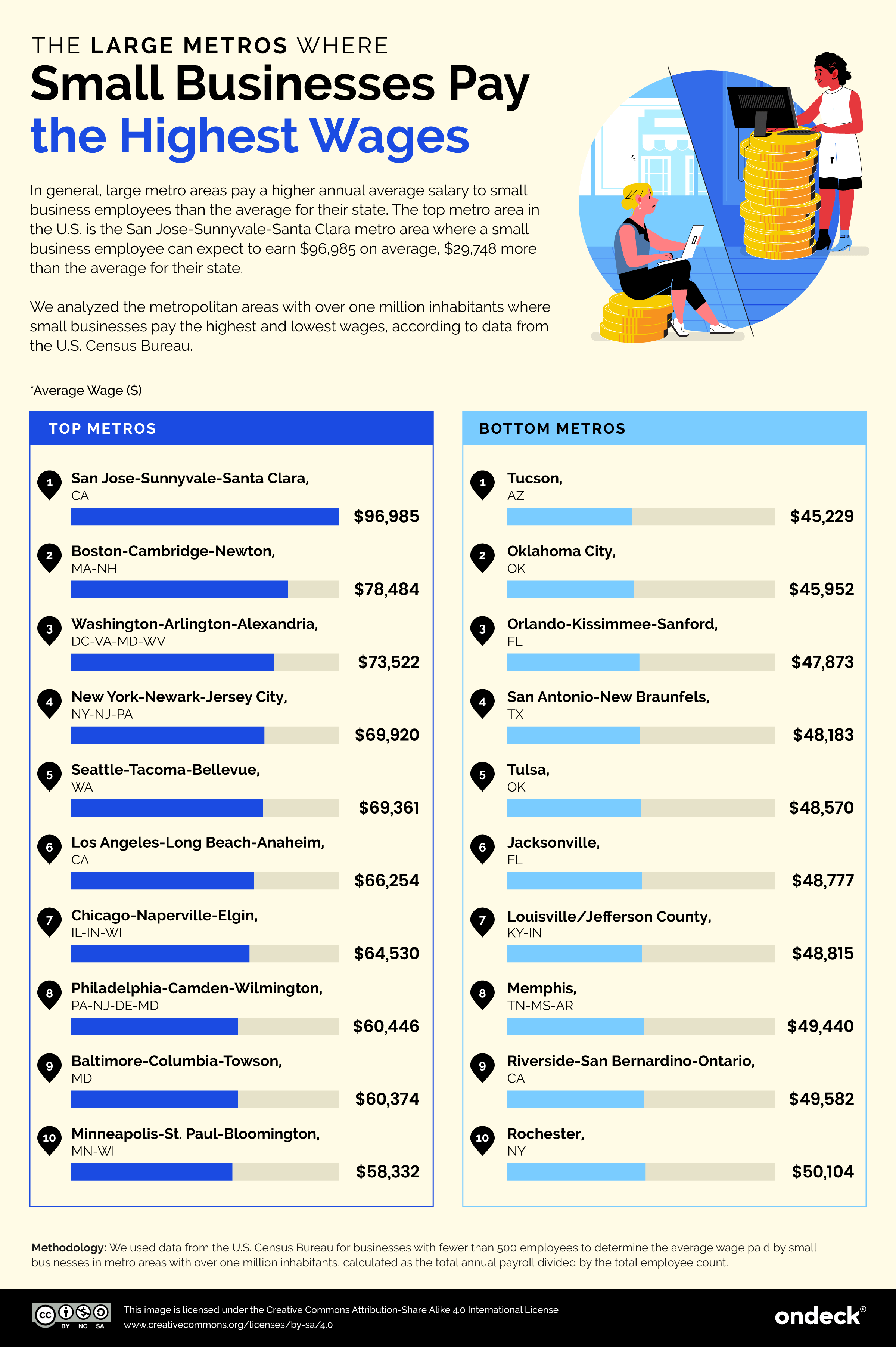 - San Jose-Sunnyvale-Santa Clara in California is the metropolitan area where small businesses offer the highest average annual salary ($96,985).