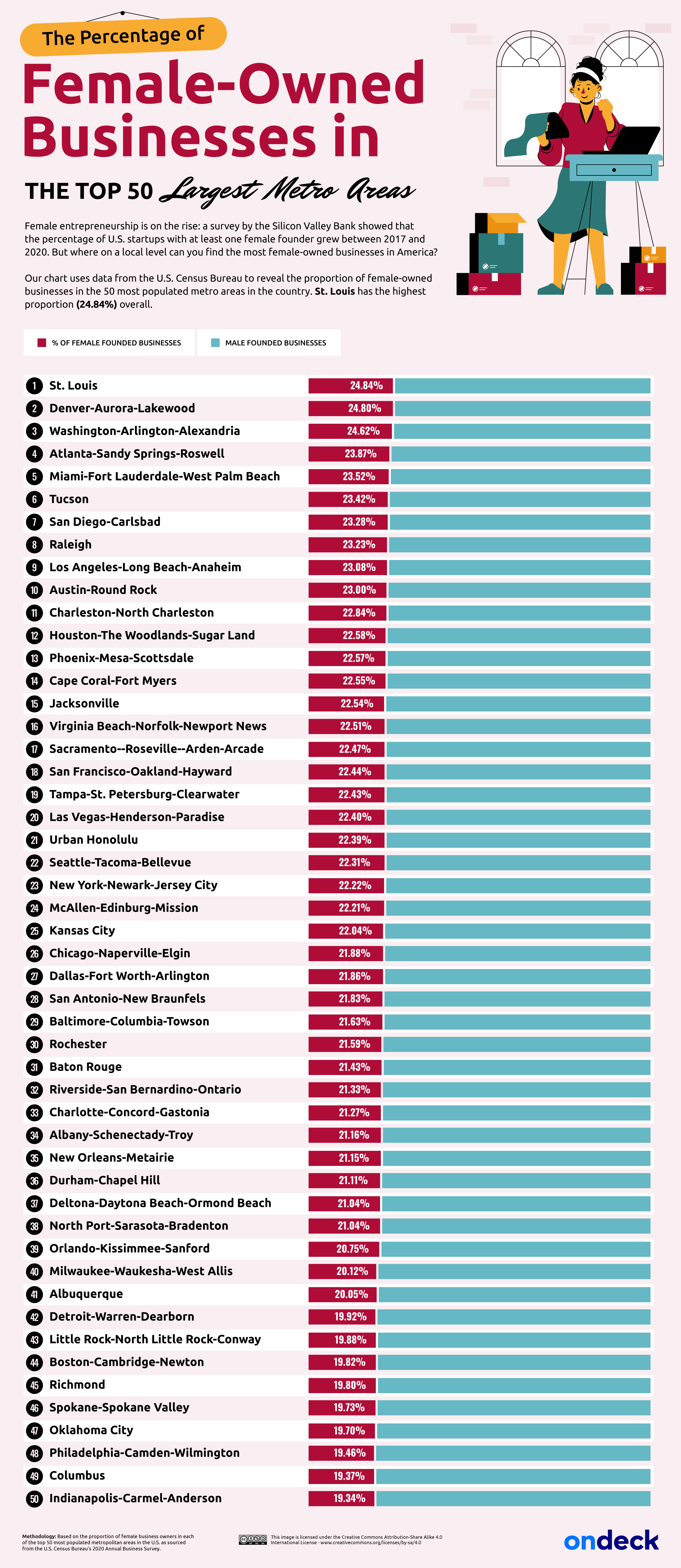 ● The highest proportion of female-owned businesses in the U.S. can be found in the St. Louis Metro Area, Missouri, where 24.84% of registered companies are founded by women, according to the U.S. Census Bureau’s 2021 Annual Business Survey.